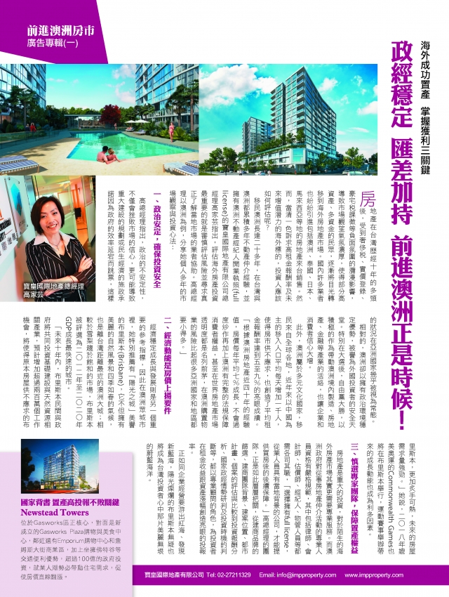 海外成功置產 掌握獲利三關鍵    政經穩定 匯差加持 前進澳洲正是時候!  房地產在台灣歷經十年的多頭後,受到奢侈稅、實價登錄、豪宅稅課徵等負面氛圍的瀰漫影響, 導致市場觀望氣氛濃厚,使得部分高資產、多資金的民眾,逐漸將目光轉移到海外房地產市場。國內許多業者也紛紛引進包括澳洲、泰國、日本、馬來西亞等地的房地產來台銷售。然而,當清一色訴求高租金報酬率及未來增值潛力的海外標的,投資人應該如何評估呢?   移民澳洲長達二十多年,在台灣與澳洲都累積多年不動產仲介經驗,並擁有澳洲不動產經紀人開業執照(full license)的寶皇國際地產有限公司總經理高家芸指出,評估海外房產投資最重要的就是審慎評估風險並尋求真正了解當地市場的業者協助。高總經理以澳洲為例,分享她個人多年的市場觀察與投資心法:    一、政治安定,確保投資安全   高總經理指出,政治的不安定性, 不僅會挫敗市場的信心,更可能導致重大建設的規劃或民生經濟的施政承諾因為政府的效率延宕而跳票,這樣的狀況在亞洲國家幾乎被視為常態。